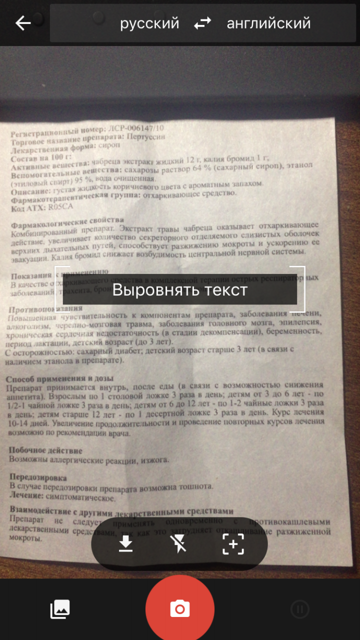С распознаванием текста через камеру все еще проще: вы наводите камеру на текст, например книги, делаете фото, программа распознает текст и предлагает нам указать конкретный текст для перевода. Попутно можно включить вспышку и приближение для лучшей четкости. Но в этом случае поддерживаются не все языки, а только 38 избранных. Какой именно язык поддерживает данную возможность, указано в самом приложении рядом с ним.