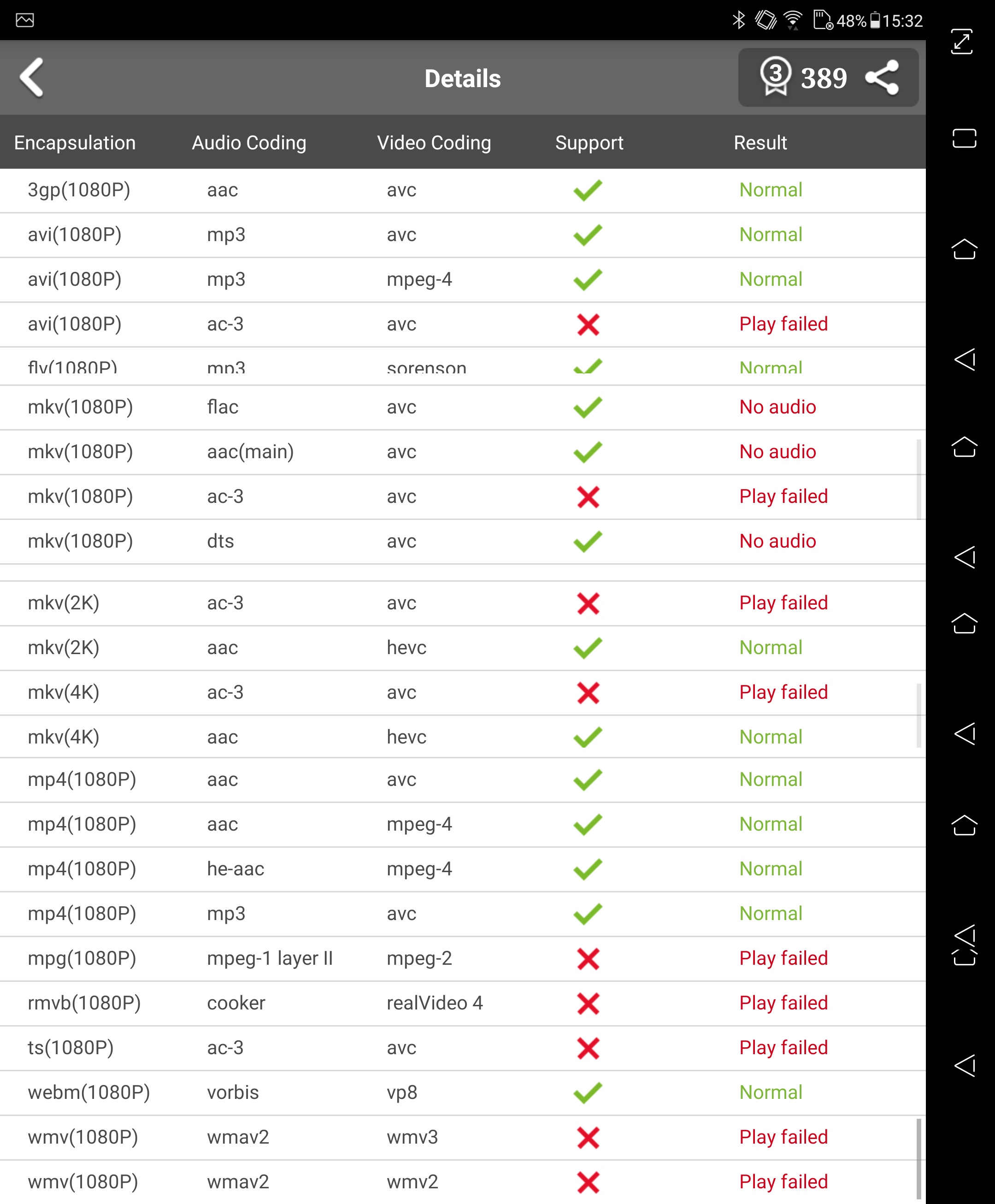 С помощью приложения Antutu Video Tester проверим количество аппаратно поддерживаемых форматов видео.