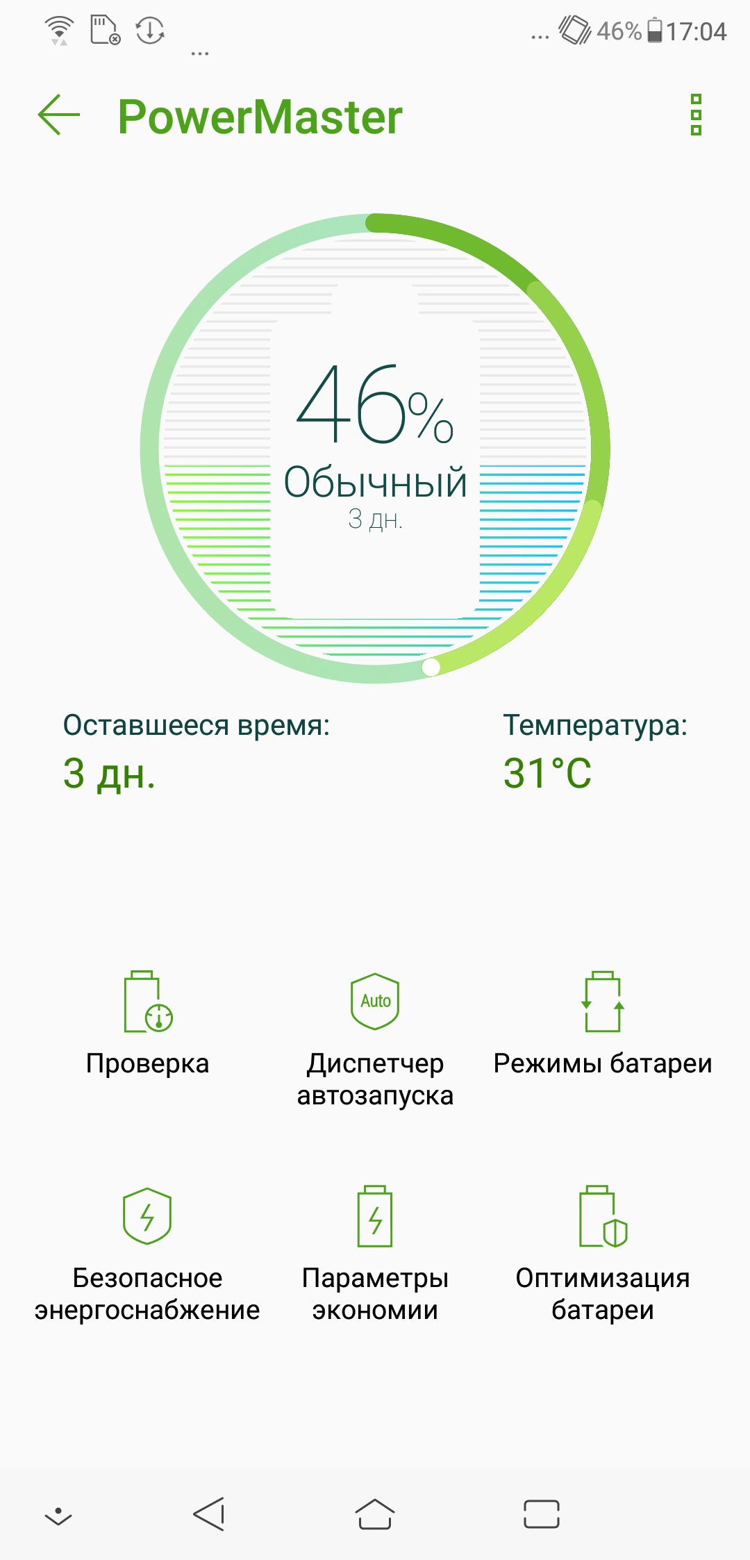 В приложении «Мобильный диспетчер» расположился раздел Power Master, предназначенный для мониторинга состояния аккумулятора и управления энергопотреблением. Например, можно выбрать один из нескольких режимов производительности аппарата.
