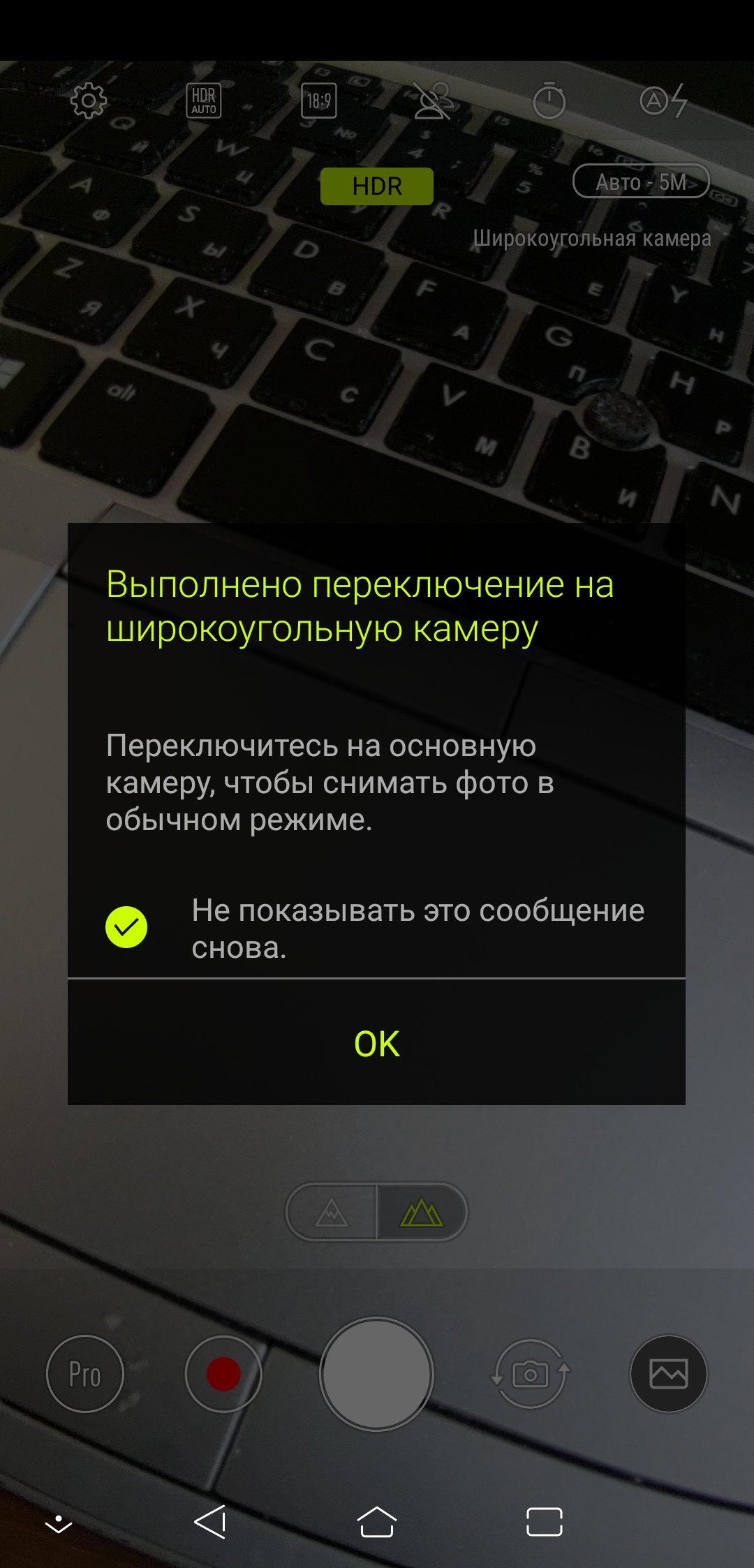 При переключении в широкоугольный режим съемки снижается разрешение и активируется дополнительный модуль основной камеры. При этом появляется соответствующее уведомление.