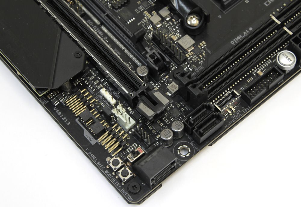 В самом углу находится кнопка Retry, кнопка Safe Boot и переключатель Slow Mode. Левее находится разъем для подключения кнопок и индикаторов корпуса, разъем NODE и колодка USB 2.0 портов. Все они распаяны так, что смотрят вниз. Поэтому для кнопок корпуса предусмотрен специальный адаптер, чтобы удобнее было их подключать. Выше находится один адресный разъем RGB LED, джампер LN2 Mode, четырех-контактный разъем для помпы, трех-контактный разъем для помпы, два контакта для датчиков температуры воды на входе/выходе, один контакт для термистора. В левой части находится звуковой кодек.