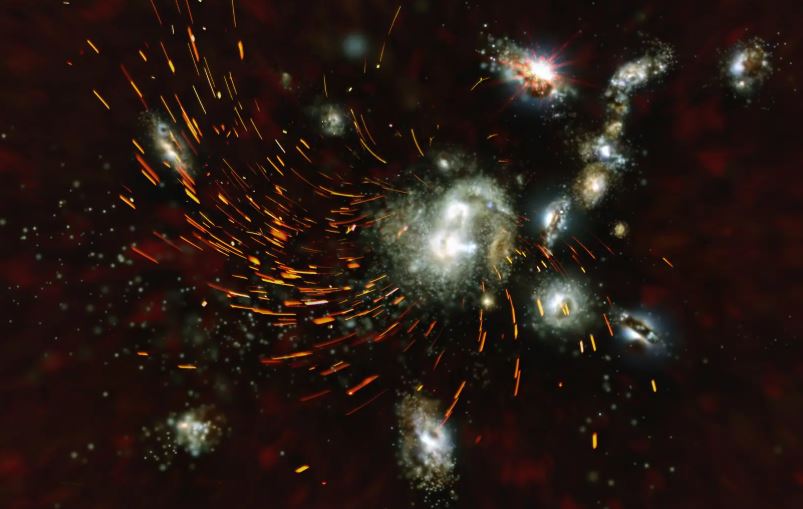 Ученые наблюдали протокластер SPT2349-56 в созвездии Феникса через телескоп ALMA. Объект существовал всего через 1,4 миллиарда лет после Большого взрыва. В центре они обнаружили четыре тесно взаимодействующие галактики, которые выбрасывали гигантские приливные рукава ионизированного газа со скоростью около 300 километров в секунду. Протяженность этих структур превышала размеры Млечного Пути.