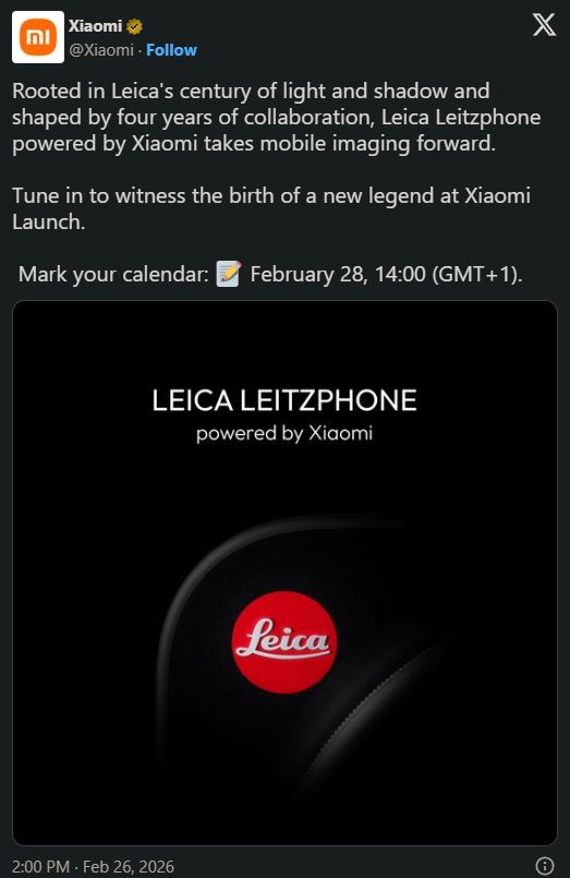 Теперь Xiaomi подтвердила это в новом тизере. Ниже представлено изображение, в котором смартфон Leica Edition присоединится к моделям Xiaomi 17 и Xiaomi 17 Ultra на мероприятии 28 февраля. Кроме того, компания сообщила, что телефон Leica Edition будет запущена во всем мире под названием «Leica Leitzphone powered by Xiaomi».