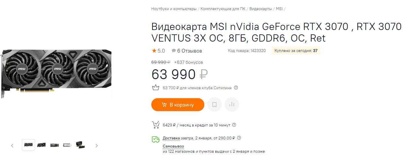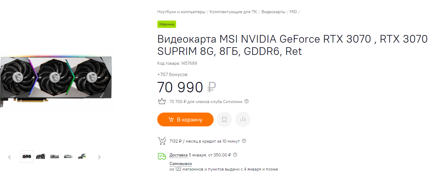 Лучшим выбором этой зимы остаётся GeForce RTX 3070. Пока о большом снижении цены говорить рано, ведь для российского рынка NVIDIA установила официальную цену в 45 490 рублей. Но в наше время мало что продаётся по рекомендованным ценам, поэтому давайте посмотрим наиболее выгодные предложения.