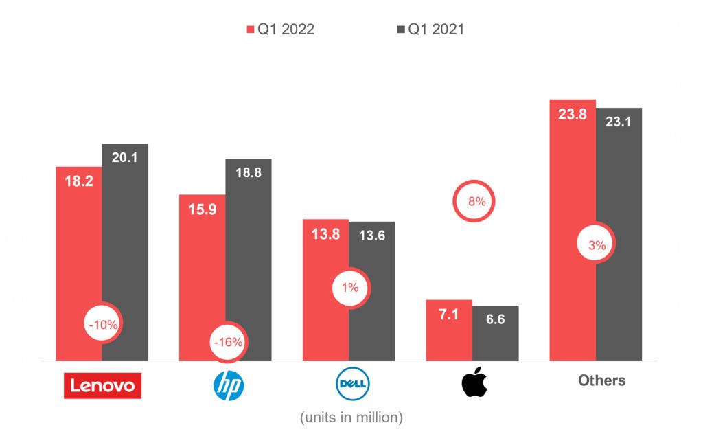 Лидерами по поставкам в первом квартале стали Lenovo (23,1%), HP (20,2%), Dell, Apple, Asus и Acer. Lenovo смогла сохранить лидирующее положение благодаря богатому выбору моделей, а Apple хорошо проявила себя за счёт линейки M1 MacBook.