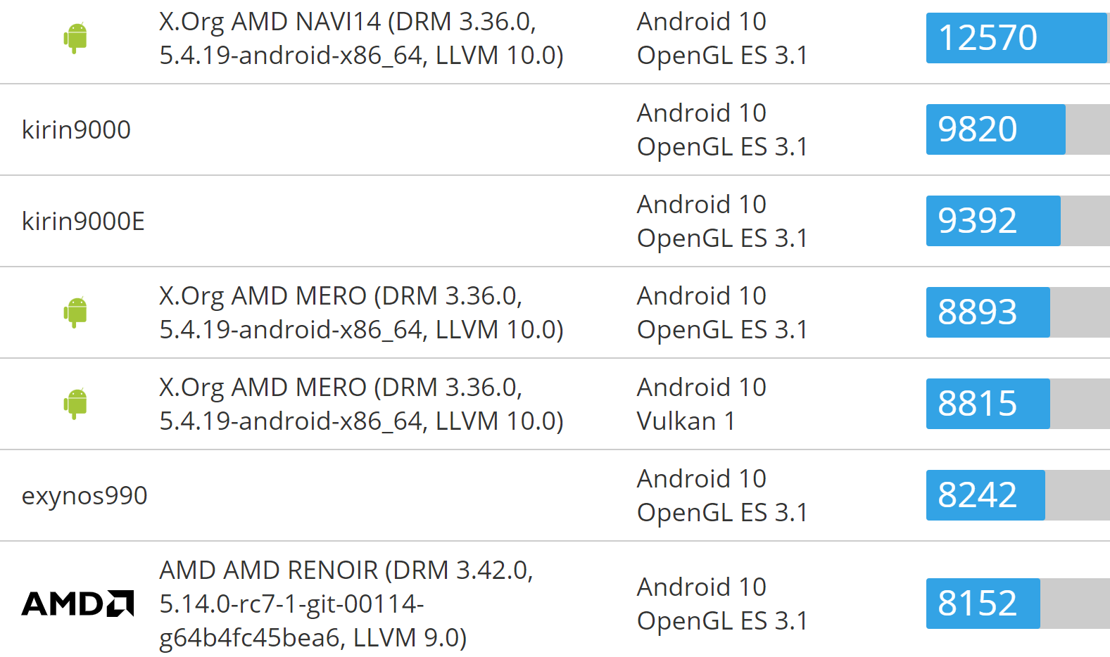 APU был протестирован с помощью теста BaseMark в операционной системе Android 10 с API OpenGL ES 3.1 и Vulkan. Согласно рейтингу BaseMark PowerBoard, он действительно быстрее, чем APU AMD Renoir (Ryzen 4000 с Vega iGPU), но только потому, что он работает с разрешением 920 на 720 пикселей.