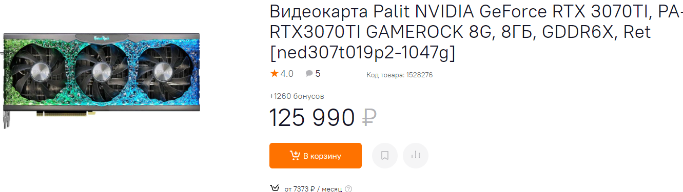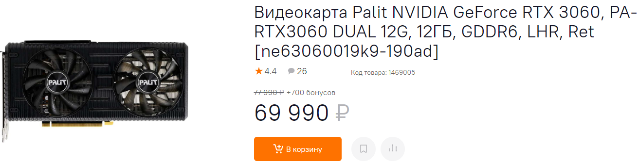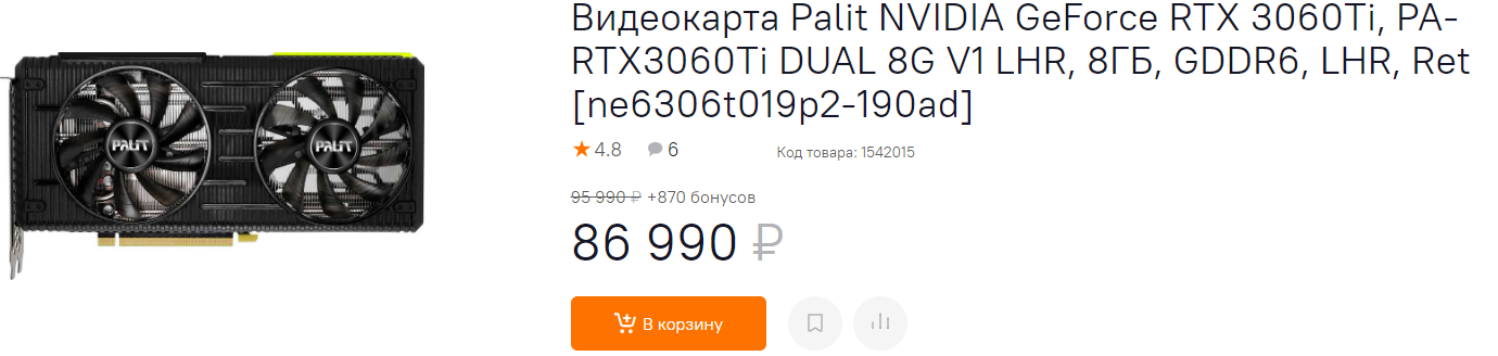 Очевидно, что флагманы плохо подходят для инвестирования. Давайте рассмотрим показатели на GeForce RTX 3060. Полноценная ферма из восьми GeForce RTX 3060 даст вам 16.49 доллара за день и всего 495 долларов за месяц. Ну а одна такая карточка генерирует скромные 62 доллара (4420 рублей). Наиболее приемлемую модель GeForce RTX 3060 мы нашли за 70 тысяч рублей. Есть одна карточка за 66 тысяч, но там ужасная система охлаждения из одного большого кулера, поэтому мы остановимся на модели производства Palit на два кулера. Выходит, что вернуть инвестиции в видеокарту GeForce RTX 3060 можно за 16 месяцев. Если вы уже готовы отправится в магазин за такой выгодной видеокартой, то мы спешим вас остановить. Дело в том, что в калькуляторе указана модель без алгоритма LHR, который даже сегодня снижает эффективность добычи на 30%. Приходится прибавить ещё 30% к 16 месяцам, что даёт нам 21 месяц возврата инвестиций.