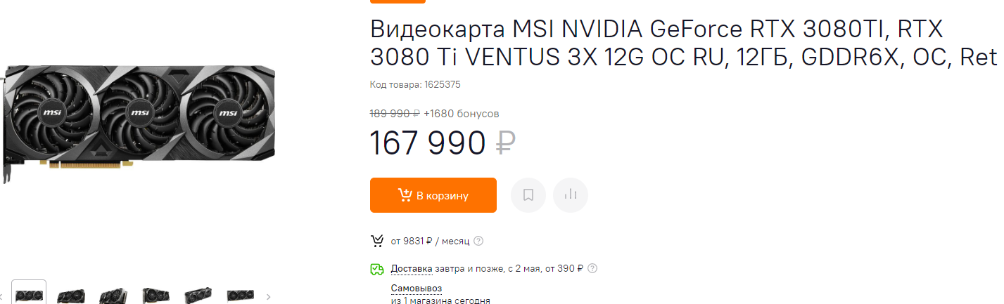 Начнём с видеокарты GeForce RTX 3080 Ti. Ферма на 8 таких графических чипом генерирует 27.69 доллара в сутки. Это 830 долларов в месяц или 104 доллара (7400 рублей по курсу на 1 мая) за этот же срок на одной видеокарте. Нам не удалось встретить GeForce RTX 3080 Ti дешевле 168 тысяч рублей, поэтому будем считать от этой суммы. Получается, что отбить вложения вы сможете за 23 месяца. Ну и где же здесь хвалёная выгода? Пока всё очень плохо.