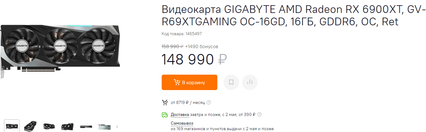 Ферма из 8 видеокарт Radeon RX 6900 XT даёт нам 20.74 доллара в сутки или 622 доллара за 30 дней. Одна такая видеокарта способна обеспечить своего владельца скромными 78 долларами в месяц (5565 рублей) при этом нам не удалось найти Radeon RX 6900 XT дешевле 149 тысяч рублей. Несложно подсчитать, что инвестиции в такую ферму можно отбить за 27 месяцев. Кто больше?