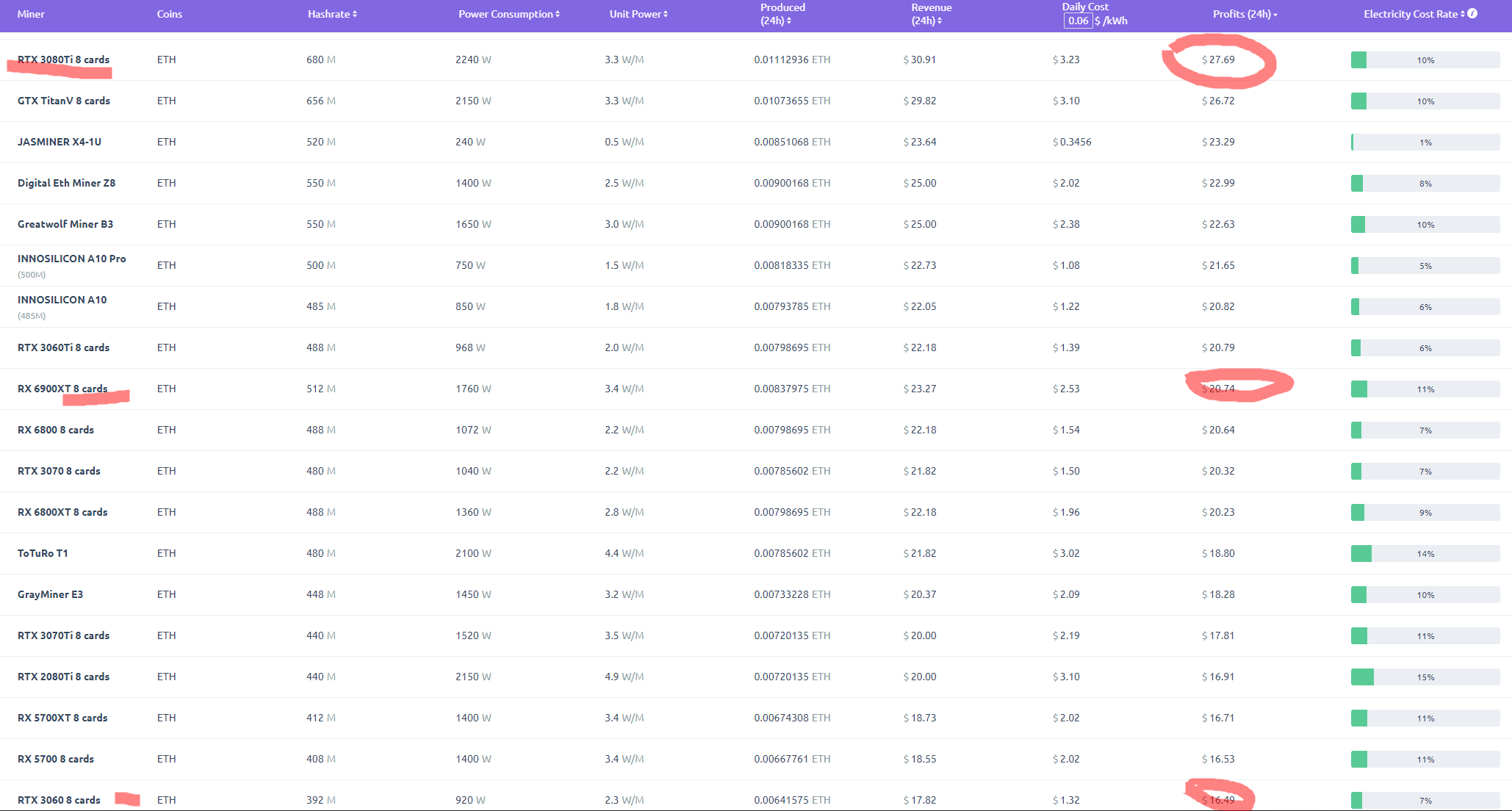 А вот для майнеров есть масса хороших новостей. Мы уже писали о том, что остановка добычи Эфира случится очень не скоро, а прежде, чем фермеры начнут терять деньги, будет реализована Бомба сложности. Поскольку даже сегодня точных сроков нет, то можно предположить, что всё это перспектива 2023 года. В связи с этим некоторые майнеры снова пытаются докупать видеокарты, расширяя свои мощности в надежде отбить стоимость инвестиций. Сегодня мы изучим несколько популярных позиций, выяснив реальный доход и сроки выхода в ноль.