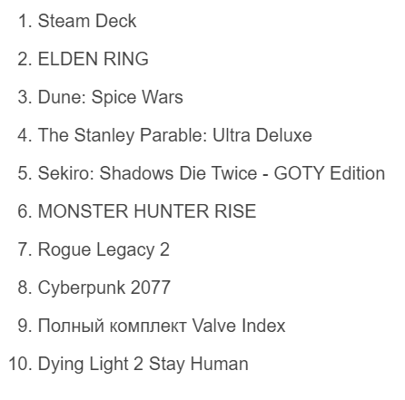 На первом месте третью неделю подряд расположился портативный игровой ПК Steam Deck, на втором, что куда более удивительно, всё ещё присутствует Elden Ring, популярность которой даже не думает падать.