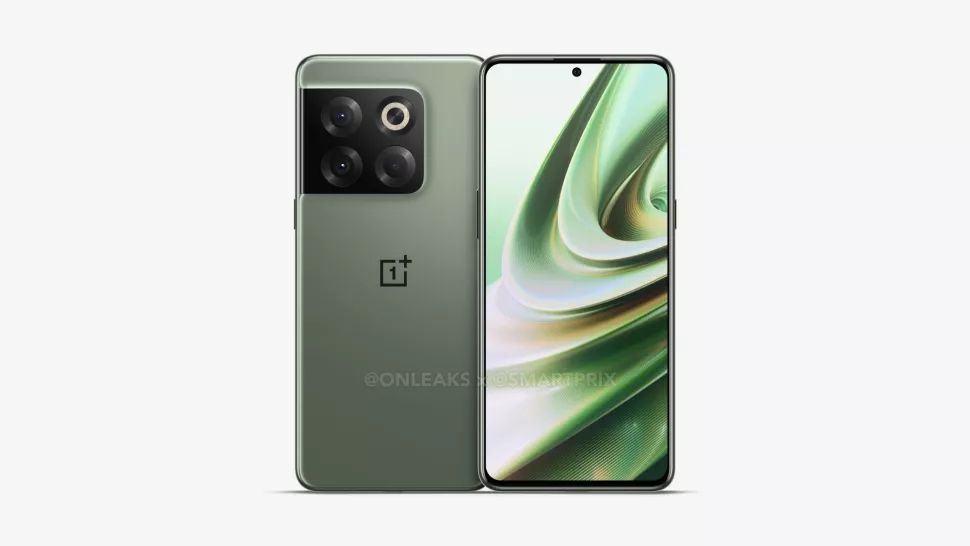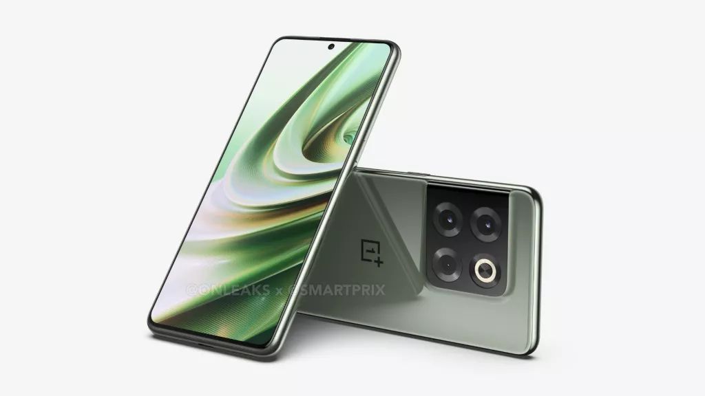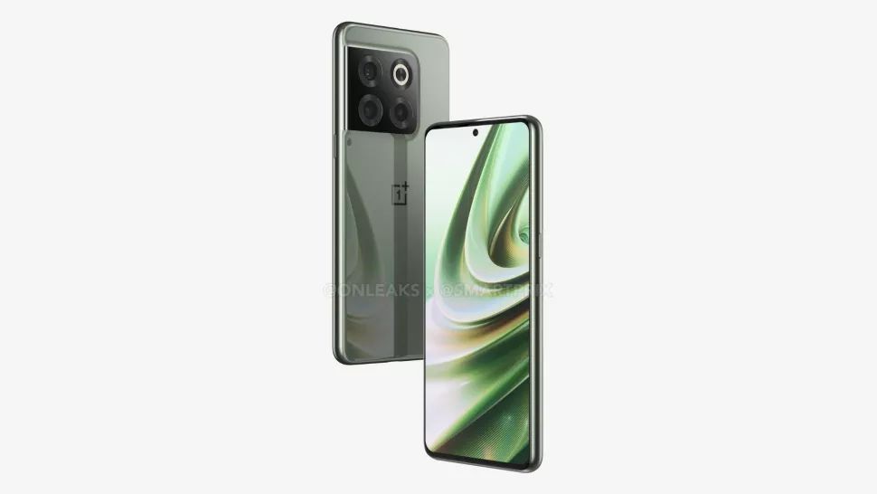У флагмана Pro экран с изгибами, но здесь он плоский. Вырез под камеру сместился из левого угла в центр. Ещё одним изменением стал пластиковый корпус вместо металлического в OnePlus 10 Pro. Ползунка уведомлений на корпусе не видно, хотя он может быть перенесён на другую сторону. Были показаны чёрный и зелёный цветовые варианты.