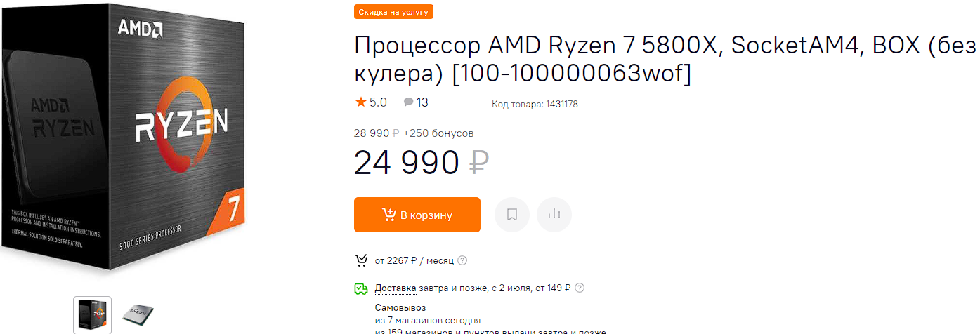 8-ядерный Ryzen 7 5800X прекрасно подходит в качестве оптимального процессора для любителей добротных сборок с прицелом на потенциал. Мы советуем вам взять материнскую плату на базе чипсета В550, включающую поддержку интерфейса PCIe 4.0. Новомодный пятого поколения есть только на последнем поколении Intel, но он ещё как минимум пару лет будет нефункционален, поскольку даже спустя полгода после выхода подходящих процессоров, нет ни одного твердотельного накопителя под PCIe 5.0. На базе Ryzen 7 5800X можно собрать высокопроизводительный компьютер, а можно обновить уже существующую сборку. 25 тысяч для такого процессора – это довольно недорого, ну и не забывайте, что рекомендованная цена на момент выхода в РФ составляла 41 тысячу, а значит у нас экономия в размере 16 000 рублей.