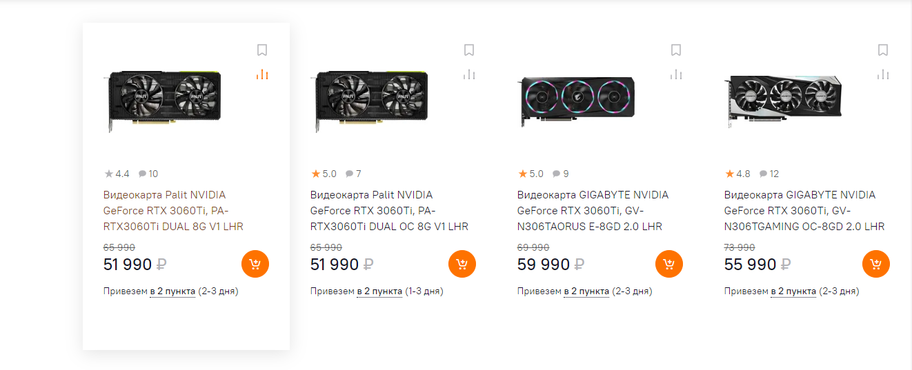 Крайне привлекательно выглядит GeForce RTX 3070 Ti. Многие наши читатели уже забыли о весёлых распродажах в ДНС. Руководство торговой сети регулярно предлагало купить несколько видеокарт по близкой к рекомендованной цене. Количество желающих измерялось десятками тысяч, а спекулянты всё равно умудрялись выхватить самые недорогие видеокарты. Сегодня не нужно никуда бежать, вставать ночью и нервно обновлять страницу, ведь GeForce RTX 3070 Ti стоит всего 57 500 рублей. Это немного ниже рекомендованной цены для РФ, что в условиях санкций выглядит настоящим подарком от дядюшки Хуанга.