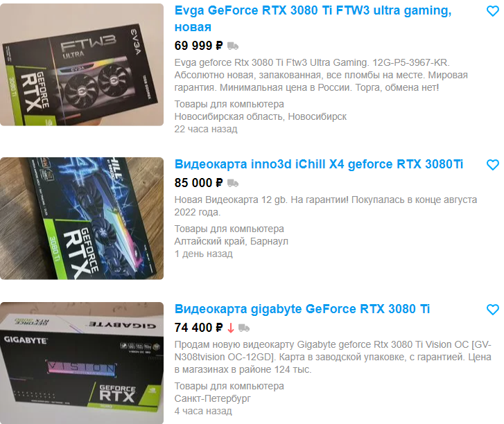 Но есть ещё один вариант – отправиться на вторичный рынок. Кто-то уверяет нас в том, что это лучшее решение, ведь там можно встретить почти новые видеокарты по цене в 2 раза ниже магазинной. Якобы, майнеры в панике сливают свои фермы, что позволяет стать обладателям флагмана за сущие копейки. Что же, мы отправились на Авито, где нашли немало противоречий. Начнём с GeForce RTX 3080 Ti. В Ситилинк самая недорогая модель производства Palit стоит 89 тысяч рублей. На Авито есть масса предложений, но мы выбрали первые попавшиеся и средние по цене. Как видите, это почти новые (или новые) видеокарты, за которые просят 70-75 тысяч рублей. Есть и дороже, но бывают и дешевле после майнеров. Если вы готовы рисковать, то можно стать владельцем GeForce RTX 3080 Ti прямиком с фермы всего за 60 тысяч.