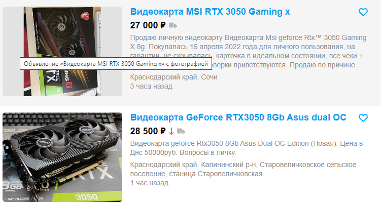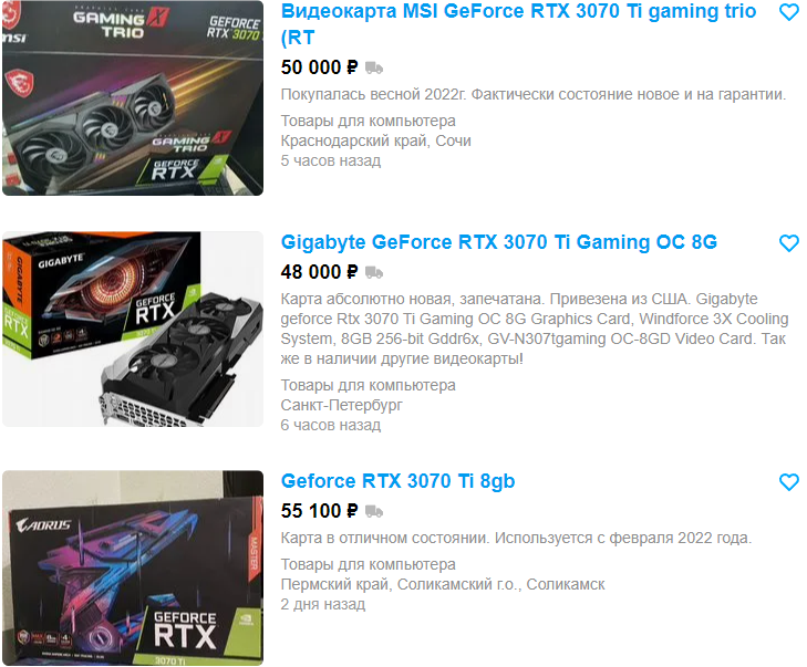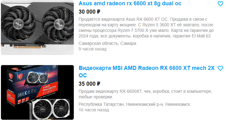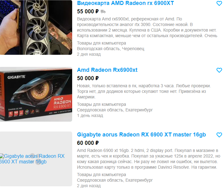 GeForce RTX 3070 Ti в Ситилинк стоит 57 тысяч рублей, а вот на вторичном рынке найти ничего выгодного не удалось. Майнеры предлагают несколько весьма сомнительных видеокарт за 50 тысяч, но есть и совсем новые, а также привезённые из США. Цены на них на уровне магазинных, поэтому мы не видим причин брать нечто подобное с рук. Разочаровывает и GeForce RTX 3050. Новая такая видеокарта стоит 26 тысяч, тогда как на вторичном рынке несколько умников пытаются продать подержанные модели дороже. Аналогичная ситуация и с Radeon RX 6650 XT. Прокачанная модель в Ситилинк оценена в 33 тысячи, тогда как менее скоростную Radeon RX 6600 XT отдельные личности пытаются продать даже дороже. А вот Radeon RX 6900 XT можно взять с большой выгодой на Авито. Как видите, цена между новой и с рук разнится на 20 тысяч рублей, а значит есть перспектива сэкономить, но не потерять ровным счётом ничего.