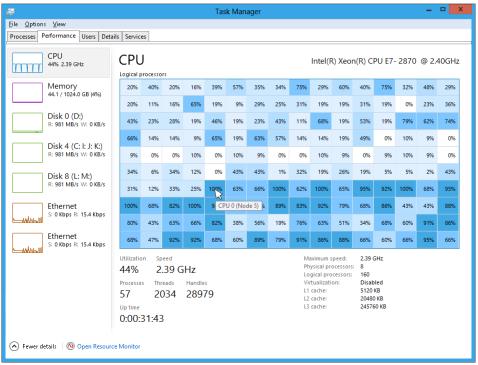 Загрузку каждого логического процессора в Windows 8 теперь можно будет оценить по одному взгляду на диспетчер задач, а соответствующий идентификатор процессорного узла будет отображаться при наведении указателя мыши на соответствующее поле. "Большим преимуществом тепловой карты является её хорошая масштабируемость для больших наборов данных. Новый диспетчер задач будет отображать столько логических процессоров, сколько поддерживает система", - прокомментировал внешний вид диспетчера задач Хейвсон.