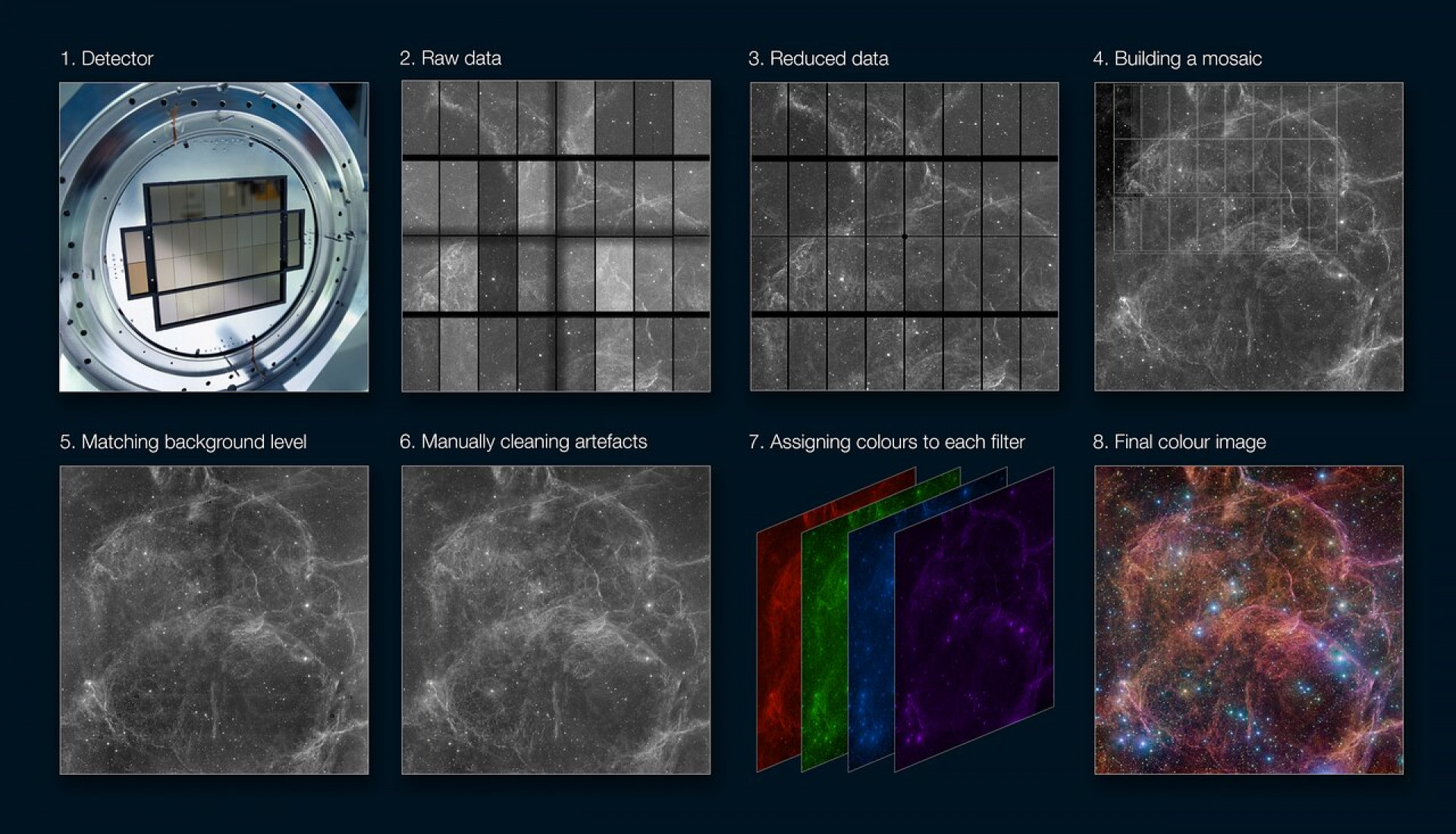 Это снимок является результатом работы группы ученых по превращению необработанных данных, полученных с помощью VLT Survey Telescope, в астрономическое изображение высочайшей четкости. Массив из 32 детекторов регистрирует свет, собранный телескопом. Необработанные изображения корректируются путем удаления битых пикселей, темных участков и перепадов яркости. Такой процесс перехода от необработанных к готовым для науки данным называется "обработкой данных".