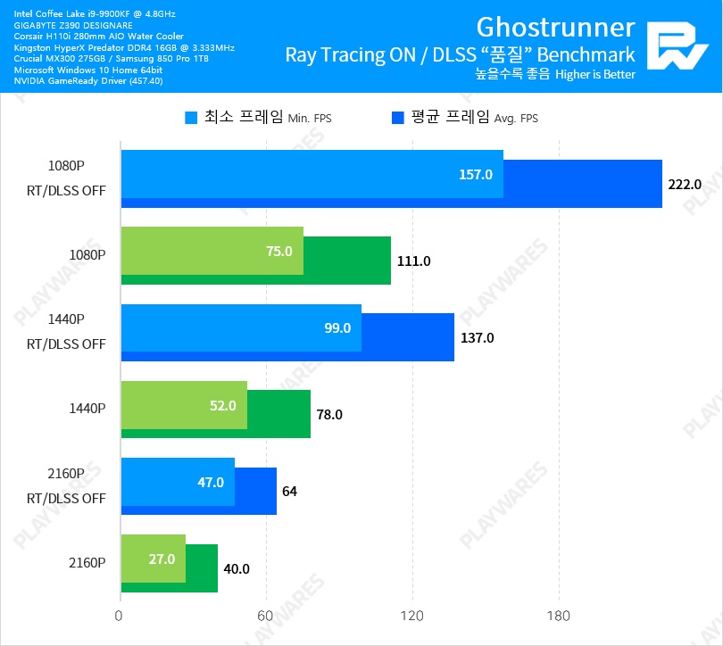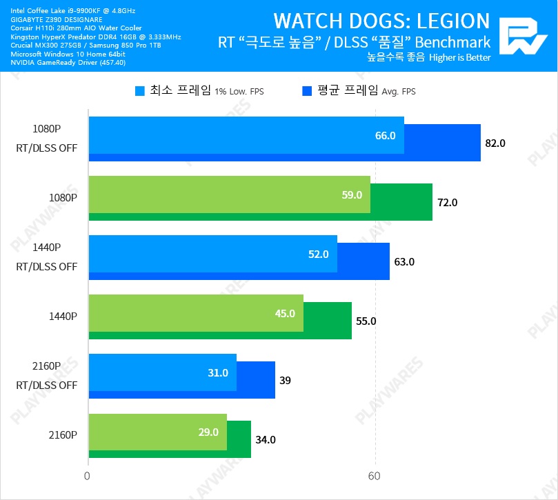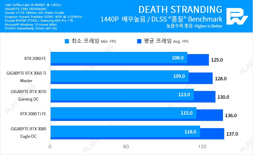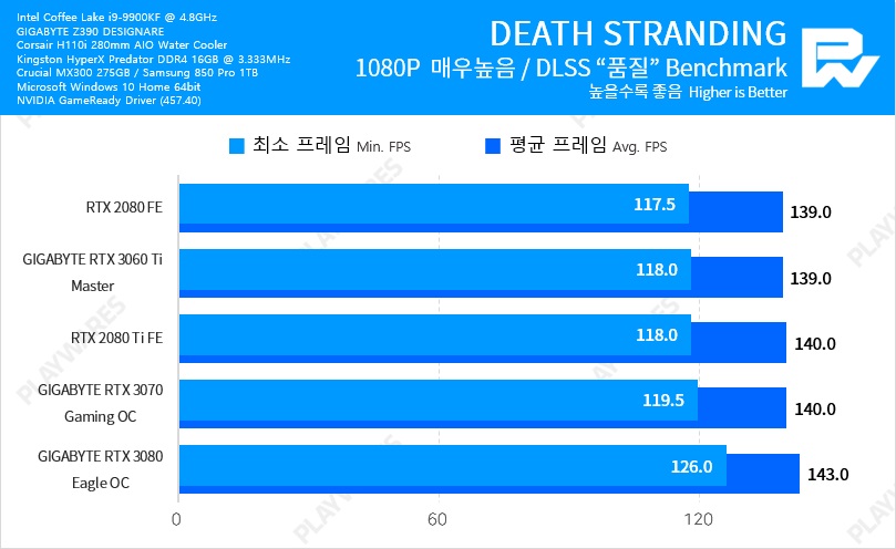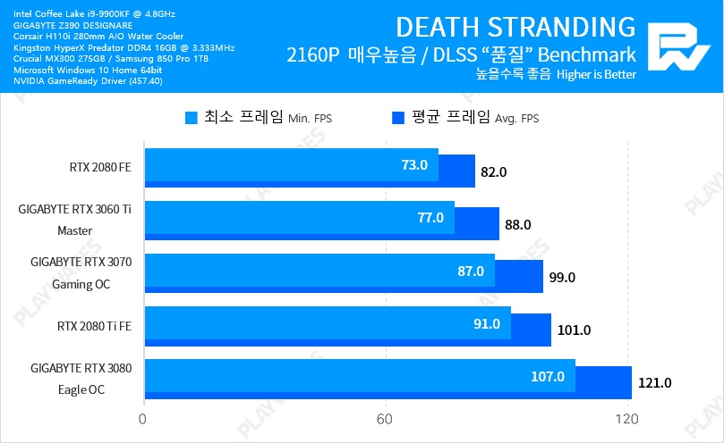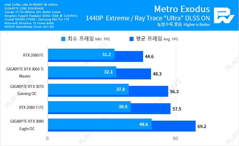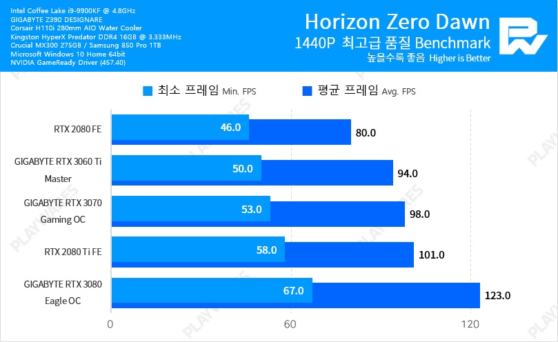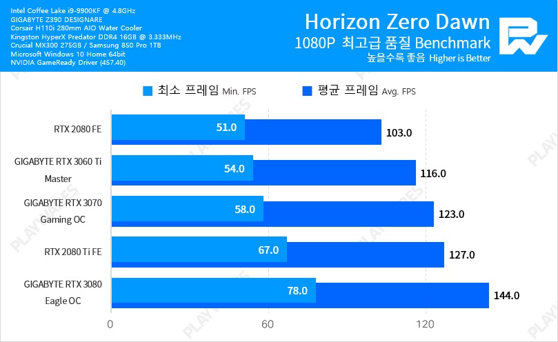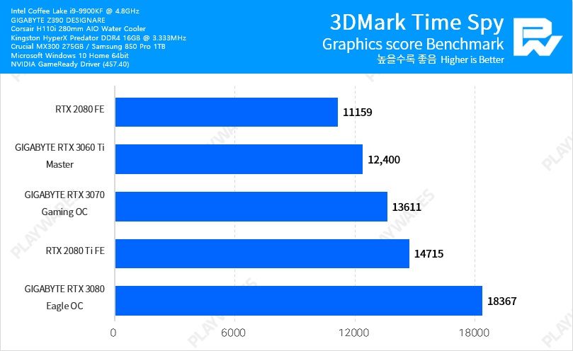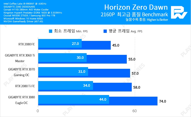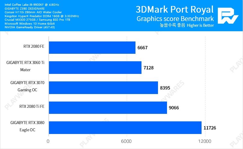 Тестовая система включала в себя видеокарту NVIDIA GeForce RTX 3060 Ti в исполнении Founders Edition, настольный процессор Intel Core i9-9900K, работающий на частоте 5 ГГц, материнскую плату EVGA Z390 DARK и оперативную память Thermaltake TOUGHRAM DDR4-4000 (19-23-23-42).