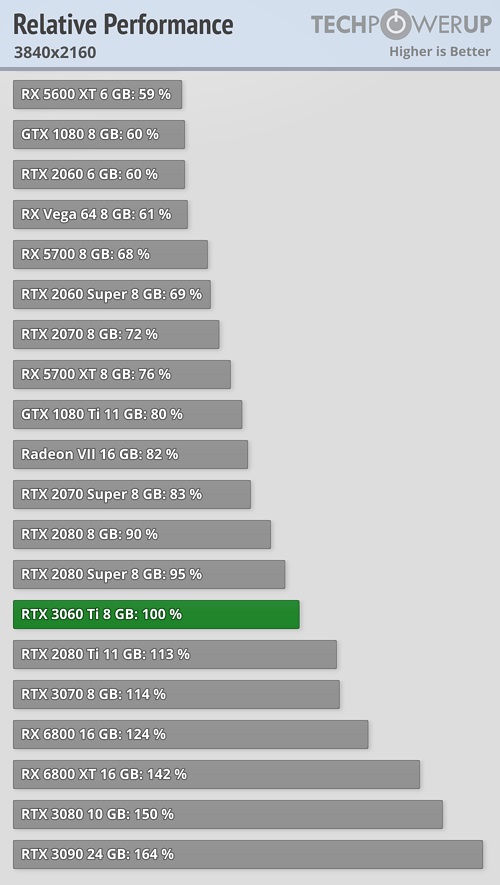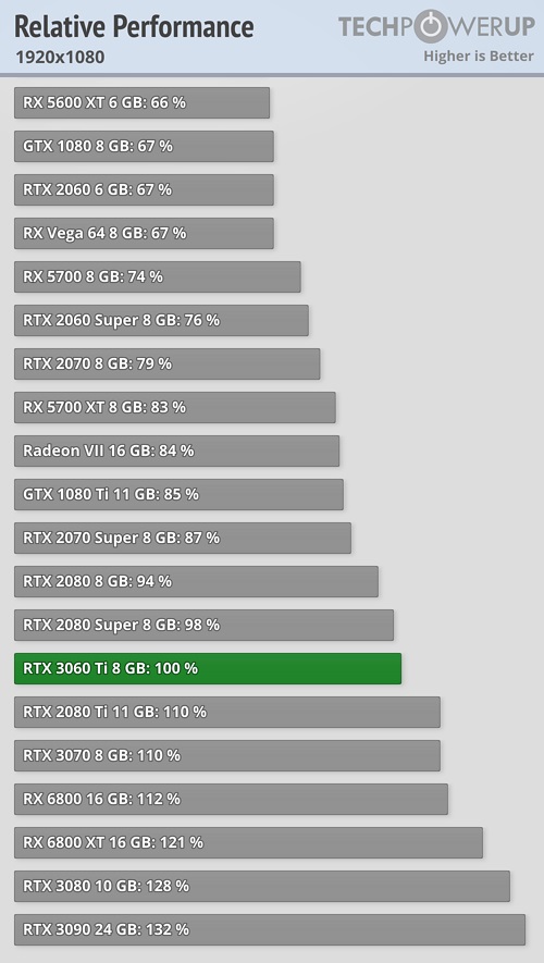 Взглянув на графики, иллюстрирующие общую производительность графических адаптеров во всех тестах, произведённых специалистами источника, можно отметить, что GeForce RTX 3060 Ti ощутимо отстаёт от своей оппонентки из стана AMD в лице Radeon RX 6800, что не вызывает особого удивления, учитывая отличие в позиционировании моделей.