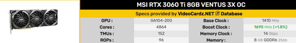 Самая простая из представленных компанией Digitec картой является RTX 3060 Ti Ventus 2X. Более детальной информации о данной карте ретейлером не предоставлено, но по заявлению продавца, частота в разгоне этой модели составляет 1695 МГц, что идентично.