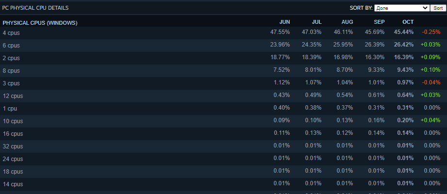 Если обратиться в статистику Steam, то становится очевидно, что обычные геймеры не спешат покупать столь мощное железо. Давайте кратко пройдёмся по динамике процессоров. Как видите, почти половину рынка занимают 4-ядерный камни. Они прочно удерживают планку несколько лет и не собираются сдавать позиции. Обратите внимание, с января по ноябрь процентная доля активных 4-ядерников снизилась всего на 2%.