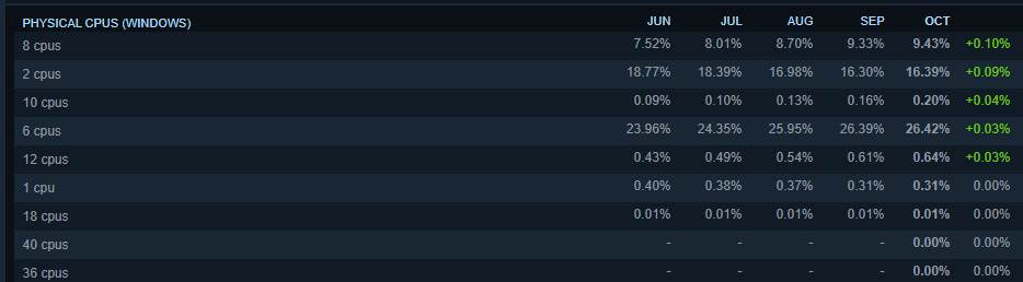 Обратите внимание на рост числа 12-ядерных и выше процессоров. Их просто нет, а значит число геймеров, которые покупают подобные камни мизерно, ведь даже 2-ядерные камни вызывают больший интерес. Что не удивительно, ведь они гораздо дешевле.