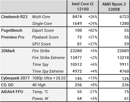 Выбор соперников для Intel Core i3-12100 обосновывался отсутствием на рынке более производительных 4-ядерных процессоров AMD на базе архитектуры Zen3. Победителем в сравнении ожидаемо оказался Core i3-12100, в различных бенчмарках и играх процессор продемонстрировал более высокую производительность. В стресс-тесте AIDA64 FPU новинка Intel оказалась холоднее при практически одинаковом энергопотреблении. Стоимость процессора остается неизвестной, по оценкам XFastest, модель будет стоить около 130 долларов США, старт ее продаж ожидается в начале следующего года.