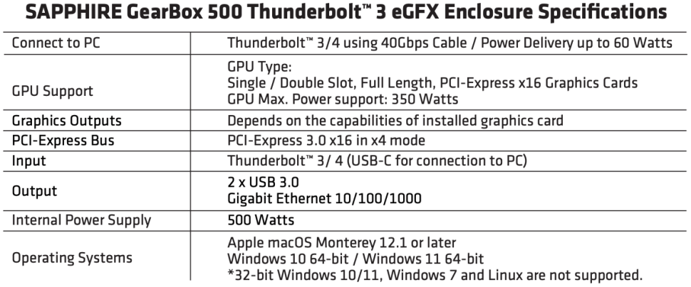 Sapphire GearBox 500 Thunderbolt 3 Pulse Radeon RX 6600 XT eGFX содержит видеокарту Sapphire Radeon RX 6600 XT на базе графического процессора Navi 23 с 2048 потоковыми процессорами и 8 ГБ памяти GDDR6. Видеокарта Pulse Radeon RX 6600 XT оснащена двухслотовой системой охлаждения с двумя вентиляторами, четырьмя выходами на дисплей (три DP 1.4, один HDMI 2.0) и одним 8-контактным разъемом питания PCIe.