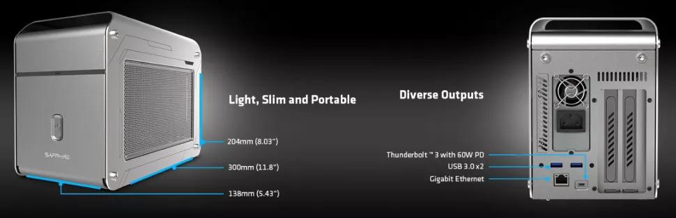 Корпус eGFX относительно компактен и имеет размеры 300 × 138 × 204 мм, что меньше по сравнению с другими подобными системами. Но это будет проблемой для тех, кто планирует обновить Radeon RX 6600 XT до чего-то более мощного.