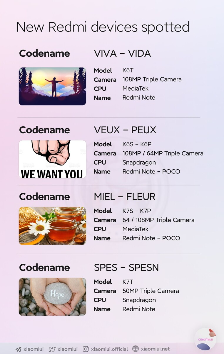 Модели Viva и Miel, как предполагается, оснащены основной камерой на 108 МП и чипсетом MediaTek. Xiaomui считает, что все устройства будут иметь датчик ISOCELL HM2, также присутствующий в Redmi Note 11 Pro Plus.