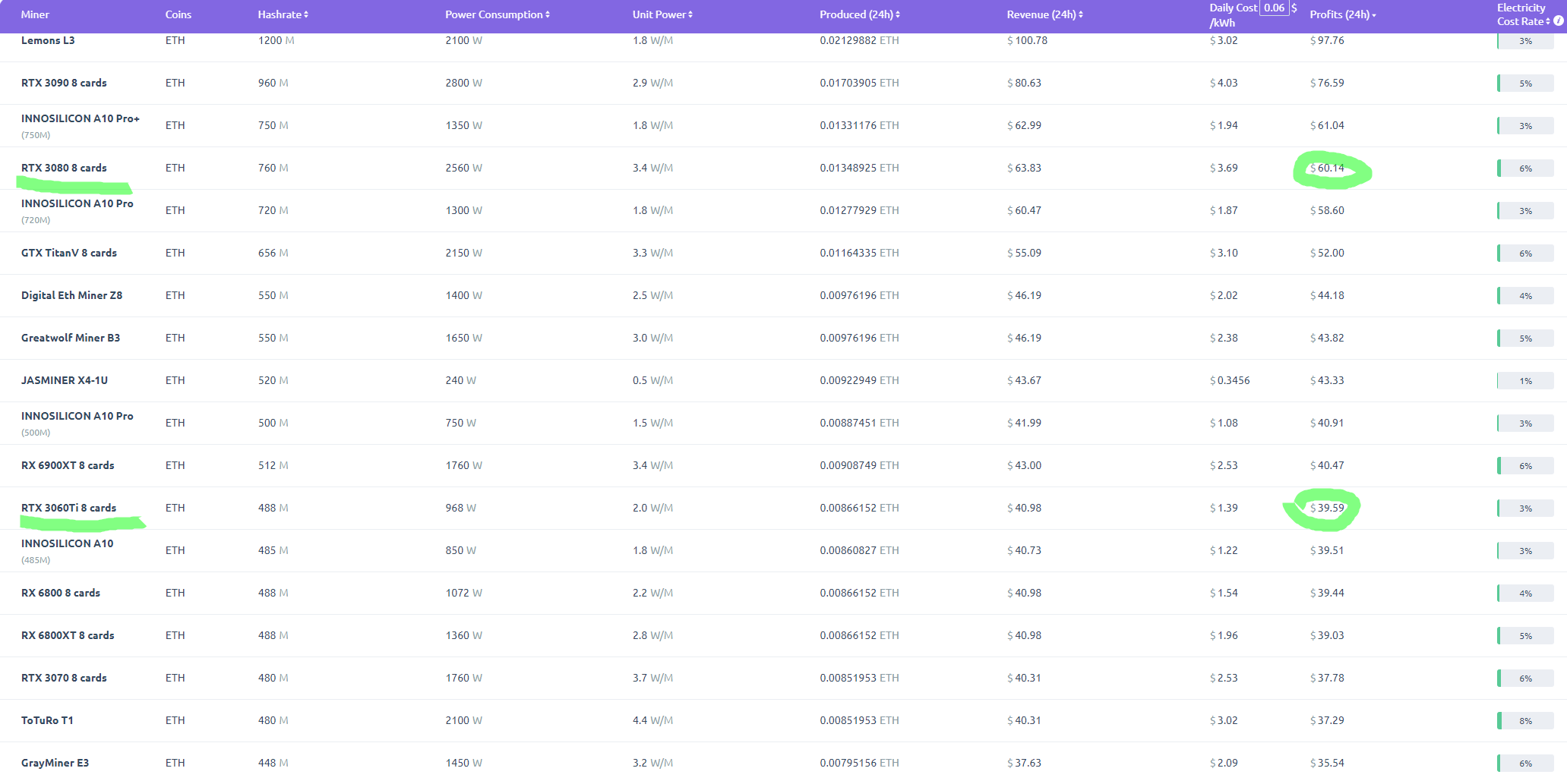 Ниже вы можете ознакомиться с таблицей, данные в которой обновляются в режиме реального времени. Это значит, что при любых изменениях цены Эфира, мы тут же увидим падение или повышение уровня доходности майнинга. Поскольку сегодня у нас вторая тенденция, то мы изучим, насколько прибыльно в настоящее время шахтёрское дело. Предположим, что вам нужна полноценная ферма из восьми видеокарт. Деньги у вас есть, системный блок есть, а значит дело за малым: купить один из вариантов: 8 GeForce RTX 3080 или столько же GeForce RTX 3060 Ti. Первая стоит 191 тысячу рублей, а вся ферма обойдётся в более чем полтора миллиона. Вторая оценивается в 106 тысяч, а значит за ферму вы заплатите 850 тысяч рублей. От этих цифр и будем отталкиваться.
