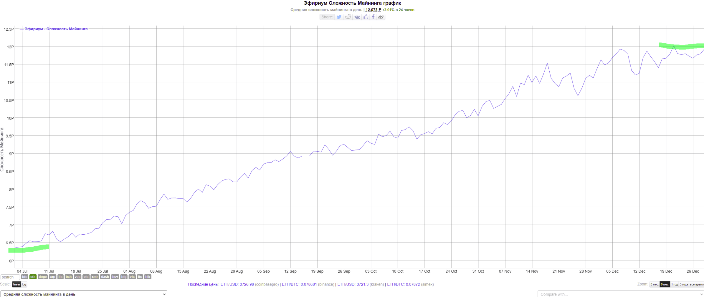 Как мы могли убедиться, на конец 2021 года доходность обвалилась в 2 раза, что объясняется увеличением сложности добычи в 2 раза за прошедшие 6 месяцев. Присмотритесь к графику ниже. В это сложно поверить, но за какие-то полгода количество подключённых видеокарт удвоилось. Впервые майнеры начали активно скупать видеокарты для добычи Эфира в 2017 году. После этого хешрейт сети был относительно стабилен, что позволяло оценивать доходность в длительной перспективе. Начиная с января 2021 года фермерам приходилось постоянно наращивать мощности, ведь постоянный рост сложности майнга привёл к скрытому падению доходности. До какого-то момента этот процесс был незаметен, ведь цена за 1 монету постоянно росла, но в декабре рекордов больше не было, а доходность буквально рухнула.
