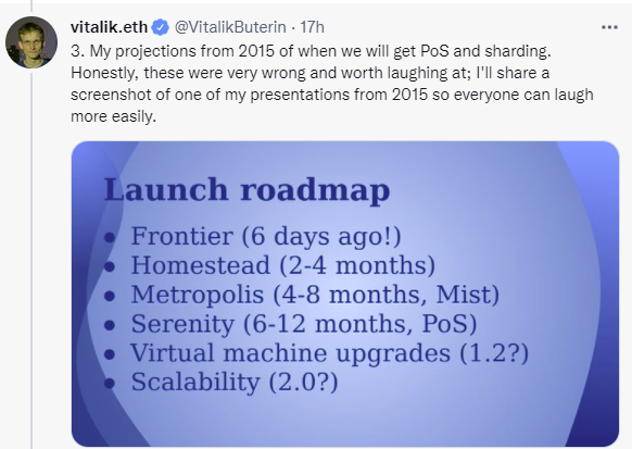 Пока все вокруг предавались празднику, отмечая наступление Нового года, Виталик Бутерин не спал. Начинается как плохой детектив, но что мы можем поделать, если всё именно так и происходило. Итак, вчера основатель Эфира опубликовал несколько любопытных комментариев, описывая путь, который прошёл он сами и основные криптовалюты. Обратимся к нашей излюбленной теме: переходу на Proof-of-Stake (PoS). По словам Виталика, сегодня он относится с юмором к своим заявлениям от 2015 года и признаёт нереалистичность планов и ошибки в реализации. Сегодня очевидно, что никакого Ethereum 2.0 в 2016 году не могло быть, но тогда всё казалось гораздо проще.