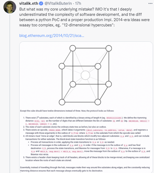 Бутерин пишет, что недооценил проблематичность внедрения хардфорков, ведь одно дело написать код, а другое – реализовать, не навредив интересам майнеров, держателей, инвесторов и многим другим. Также он отмечает, что на тот момент идеи были слишком сложными. В пример он приводит «12-мерные гиперкубы». Попытки внедрить нечто подобное заняли много времени, а сегодня разработчики Эфира отдают предпочтение простым схемам, пытаясь найти компромисс.