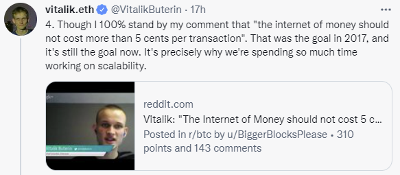 Не забыл Виталик и о больной теме комиссий. Нужно понимать, что именно высокая плата за перевод монет Эфира не позволяет данной криптовалюте стать народной. Всё дело в том, что перевод 10 долларов может стоить 5 долларов, а весной обходился в 50 долларов и дороже. Бутерин пишет, что планировал решить данную проблему ещё в 2017 году. На дворе 2022, но высокие комиссии в сети Эфира всё ещё сковывают прогресс. По словам Виталика, именно решение проблемы масштабируемости станет ключевой в обозримой перспективе.