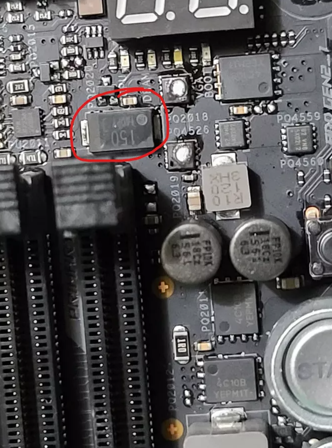 Если у вас есть Asus Z690 Hero и вы не знаете номер партии, вам необходимо проверить конденсатор, который вы видите в кружке на изображении выше (он находится между слотами DIMM и устройством чтения Q-кода). Если цифра «150» перевернута, лучше прекратить использование материнской платы и обратиться в службу поддержки клиентов Asus.