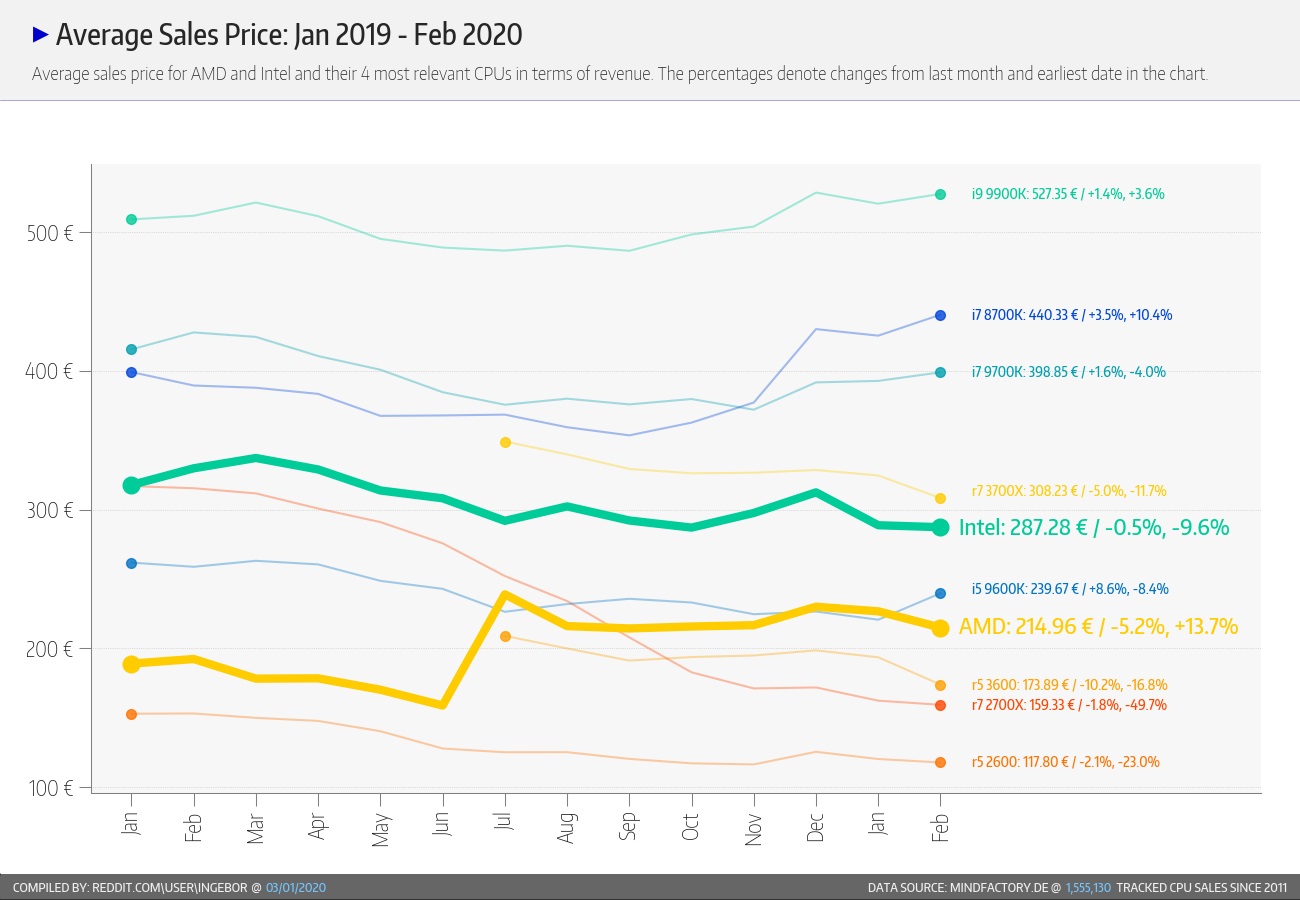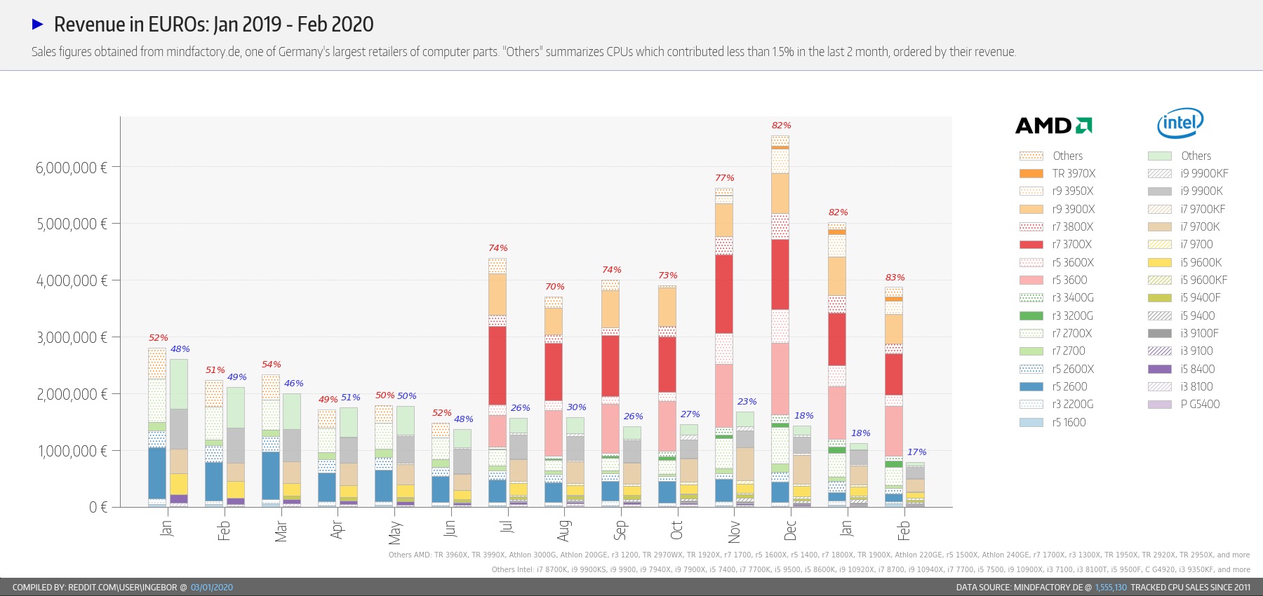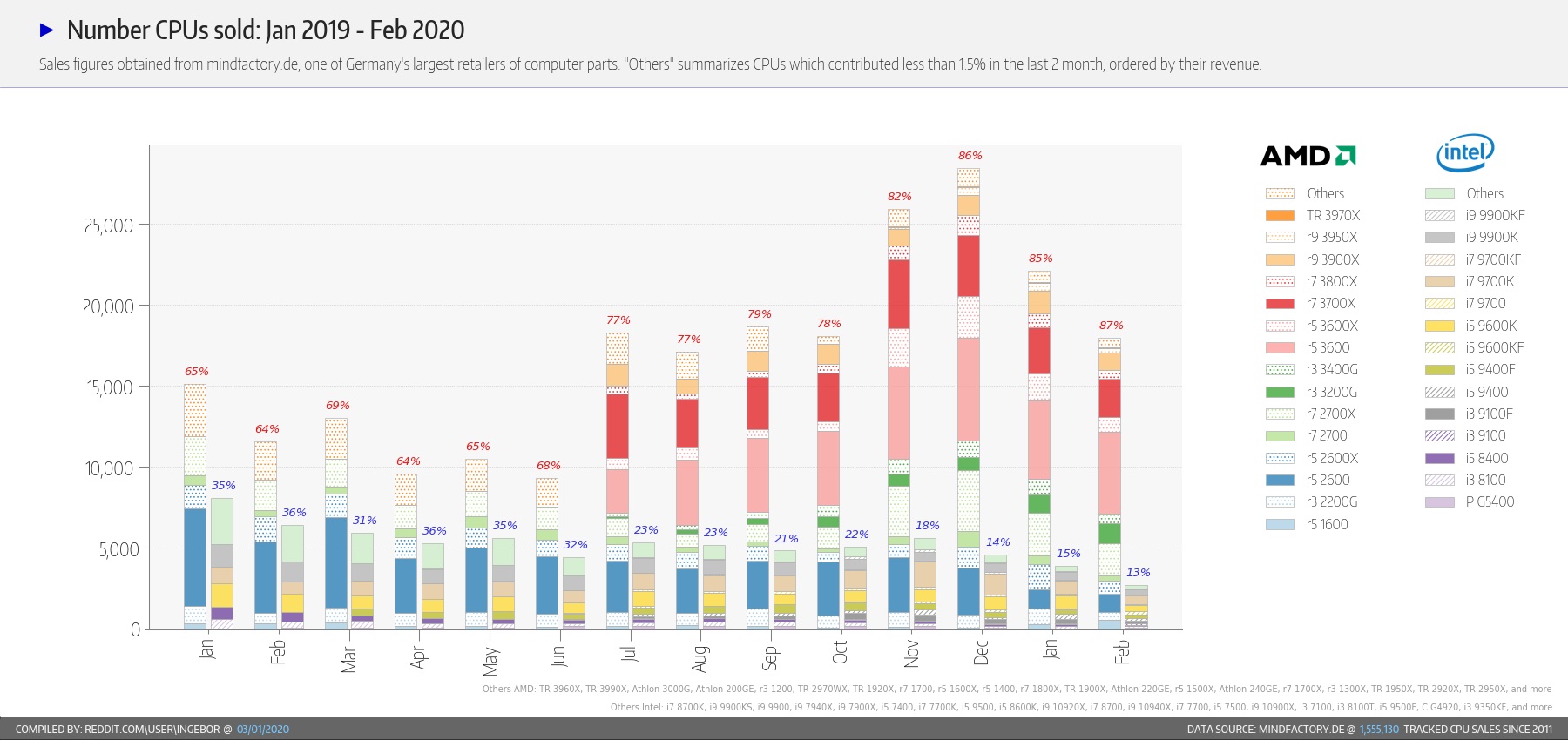 Известный энтузиаст статистического анализа Ingebor выложил очередную порцию данных об итогах февраля с точки зрения немецкого интернет-магазина MindFactory. Это одна из немногих торговых точек, не скрывающих свою статистику, поэтому соответствующие данные и появляются в поле зрения общественности с такой регулярностью.