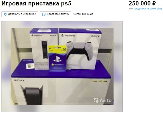 К примеру новую игровую приставку Play Station 5 с дисководом некоторые личности предлагают приобрести за 135 тысяч рублей, при рекомендованной цене в районе 50 тысяч рублей.