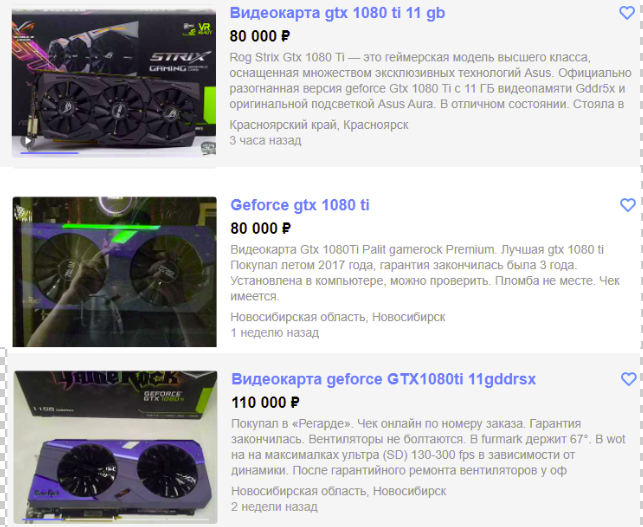 Прежде всего предлагаем вам взглянуть на GeForce GTX 1080 Ti. Ещё недавно она стоила в районе 50 000 рублей, ну а сегодня появились предложения от 80 тысяч и выше. В данном случае мы рекомендуем вам не поддаваться ажиотажу. Даже если видеокарты действительно перестанут поступать на российский рынок, они не относятся к классу жизненно важных, поэтому уже вскоре цены на них пойдут вниз. Особенно любопытно, что раньше многие продавцы предлагали аргументированный торг, ну а сегодня эти ребята решили, что владеют крайне ценным товаром, который обязательно купят. Удачи мы им желать точно не будем.