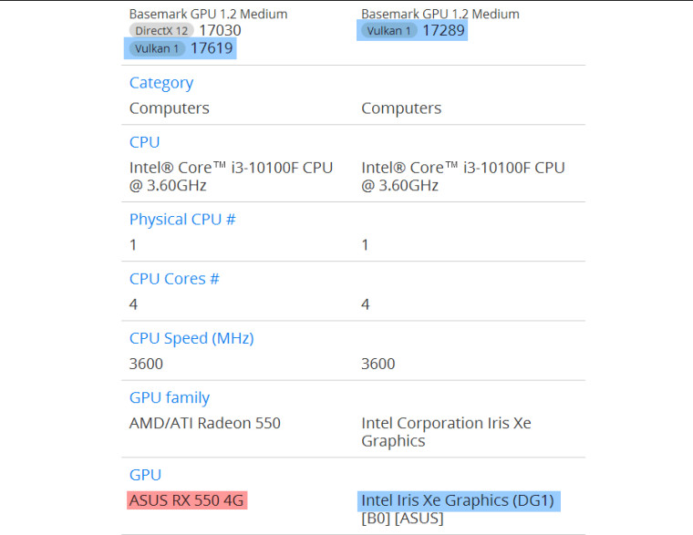 Тестирование новинки проводилось в режимах Vulkan High и Medium, результаты которых составили 1267 и 17289 баллов соответственно. Это ставит дискретную видеокарту DG1 чуть ниже давно устаревшей Radeon HD 7850, которая набирает 17349 баллов с тем же API и в той же операционной системе. TUM APISAK, обнаруживший эту запись, сравнил видеокарту с Radeon RX 550 с немного более современной архитектурой Polaris: