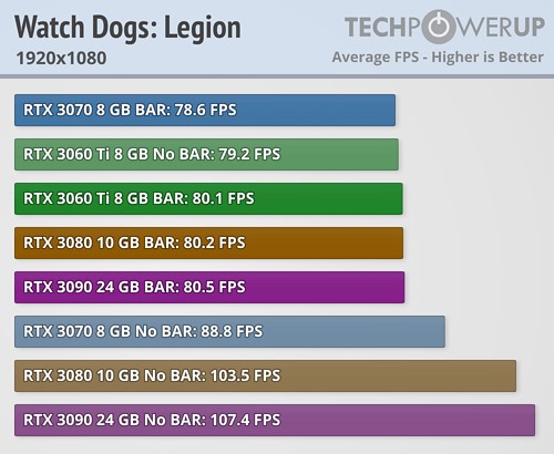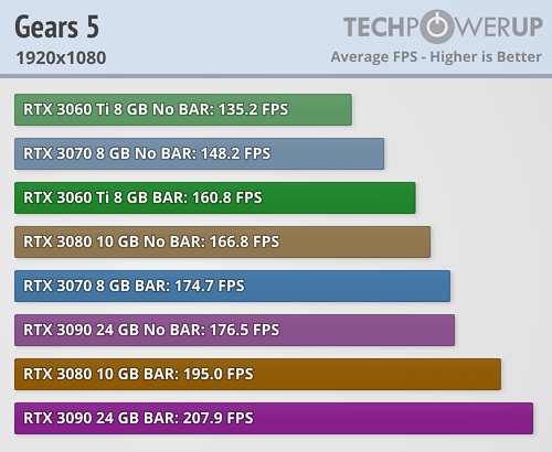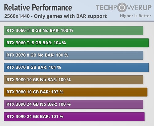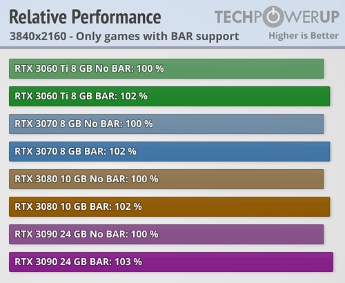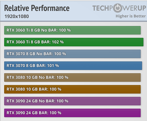 Поскольку 9% - это очень много, то было бы неверным слепо доверять NVIDIA. Именно поэтому эксперты портала Techpowerup провели большое тестирование, задействовав все актуальные видеокарты в 22 играх. Стоит отметить, что на самом деле технология Resizable BAR работает только с 17-ю играми, поэтому все остальные даны для сравнения. Доступны результаты по трём разрешением. От 1080р, до 4К. Ниже можно рассмотреть средние показатели, больше подробностей можно увидеть здесь.