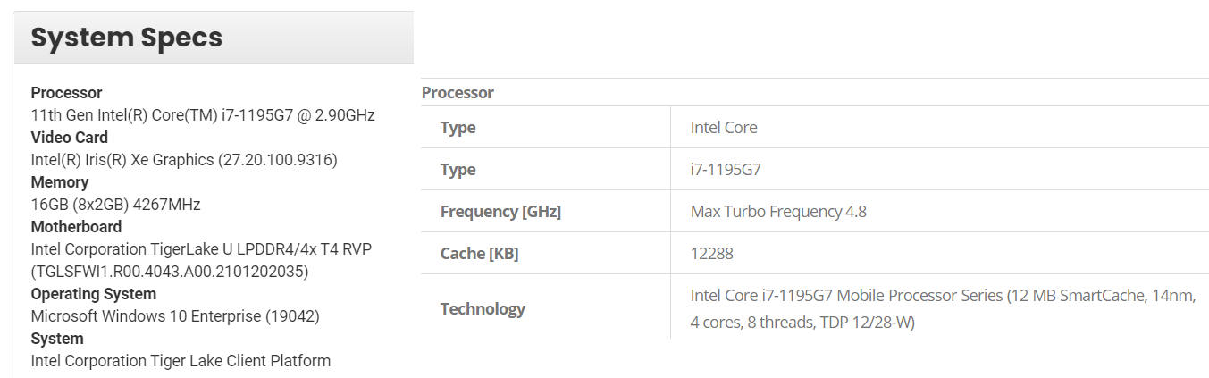 Компания Intel также планирует обновить процессоры серии UP3. Инсайдер @Momomo_us недавно обнаружил новые модели. Есть даже тест от PugetSystems с процессором Core i7-1195G7, предположительно с базовой тактовой частотой 2,9 ГГц. В целом данные об этих моделях со сверхнизким энергопотреблением ограничены. Есть информация, что максимальная турбо частота составит 4,8 ГГц, то есть это та же частота, что и у текущего флагмана Core i7-1185G7. Таким образом, различие между моделями ожидается в изменении в турбо частоты для всех работающих ядер и, возможно, в интегрированной графике.