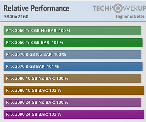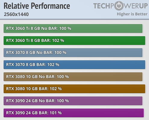 Несколько дней назад технология Resizable BAR, дающая центральному процессору доступ ко всему объёму видеобуфера графического адаптера, что положительным образом сказывается на уровне производительности в ряде игровых приложений, наконец-то стала доступна для всех обладателей десктопных видеокарт поколения Ampere, а специалисты ресурса TechPowerUp решили на практике проверить, насколько хороша новая функция.