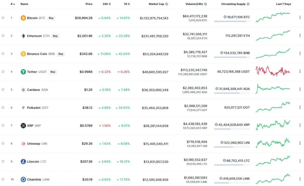 Главным драйвером роста крипторынка стало укрепление курса Bitcoin, который за неделю подорожал на 13% и сейчас пытается повторно преодолеть рубеж в 60 000$. Позитивная динамика курса главной криптовалюты привела к увеличению стоимости других альткоинов из топ-10 CoinMarketCap. Самые впечатляющие темпы роста продемонстрировали Binance Coin (+42,04%), Polkadot (+24,93%) и Chainlink (+17,74%).