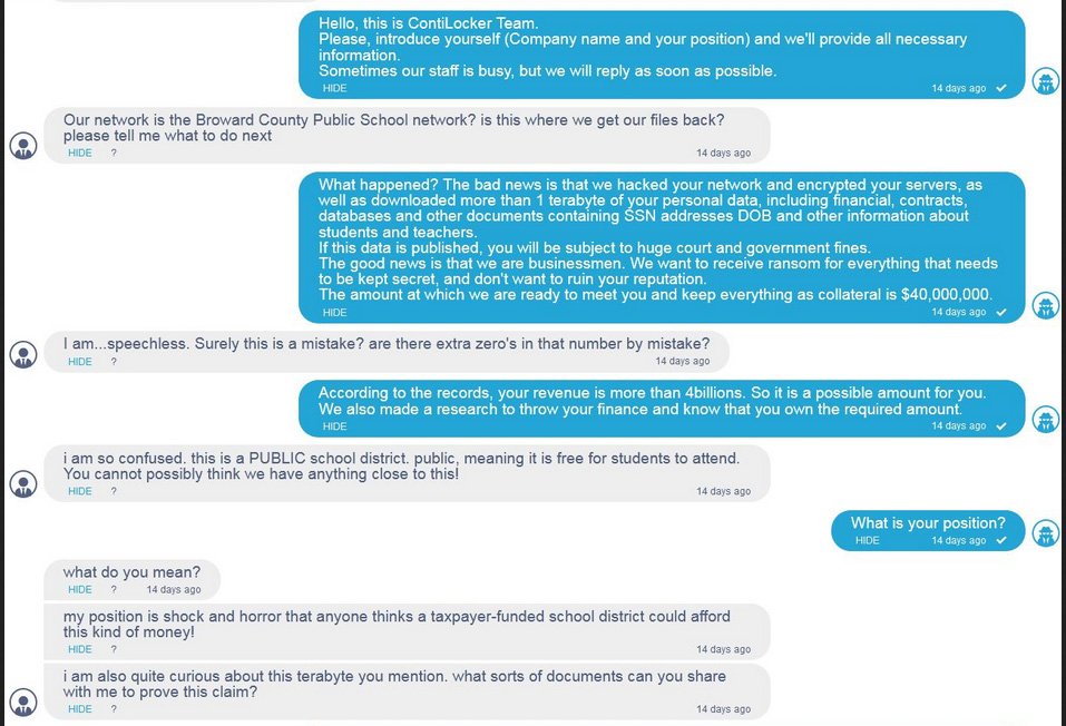 В прошлом месяце государственные школы округа Бровард Флориды были вынуждены закрыть свои ИТ-системы после того, как они подверглись кибератаке. С тех пор школьная система не разглашала никакой дополнительной информации об атаке. На этой неделе ответственность за атаку взяла на себя хакерская группировка Conti. После того, как переговоры провалились, злоумышленники опубликовали скриншоты переговоров о выкупе в результате нападения на государственные школы округа Бровард.