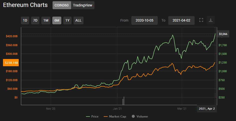 Курс эфира сегодня достиг 2082 USD, превзойдя предыдущий максимум в 2040 USD на 2%. Для достижения нового рекорда стоимости эфиру потребовалось менее полутора месяцев.