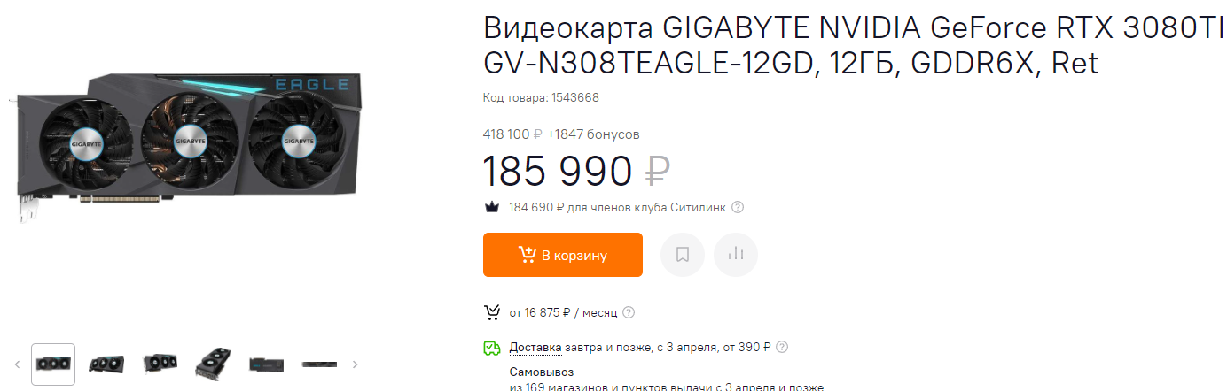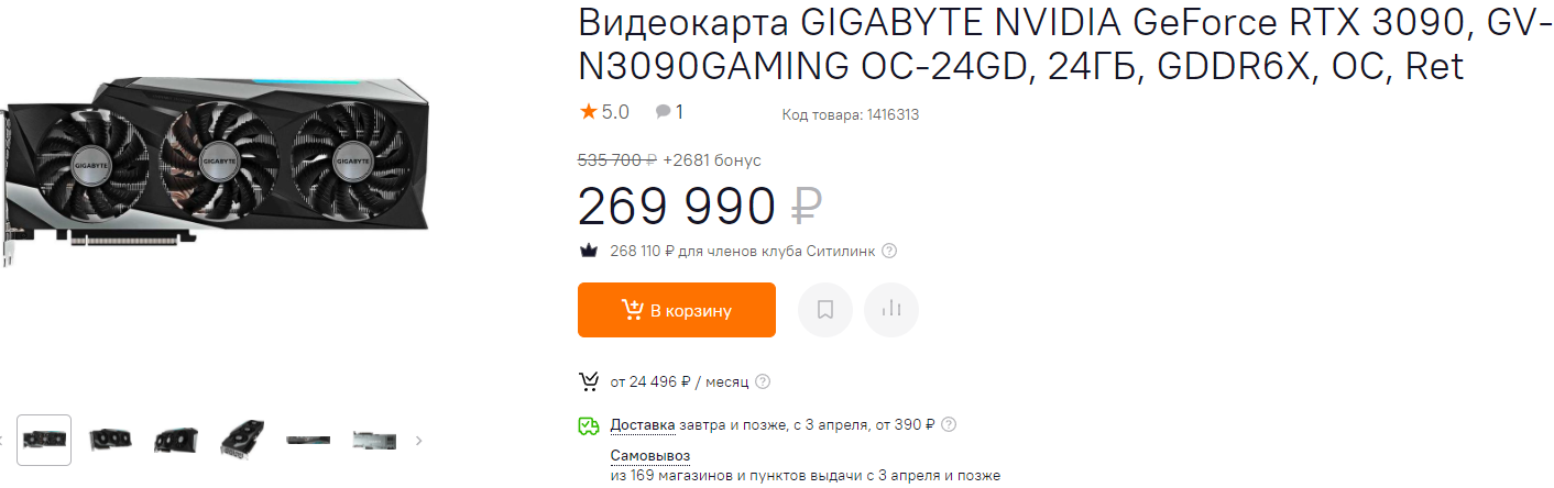 Ну а сегодня мы в очередной раз покажем, что нужно было слушаться наших советов, ведь мы весь март вам прямо говорили о том, что нужно немного подождать. Но давайте перейдём к предмету нашего материала. GeForce RTX 3090 в начале марта стоила больше 600 000 рублей, после этого она подешевела до 535 тысяч, а сегодня её можно купить за 270 000 рублей. Это больше чем в 2 раза дороже её рекомендованной стоимости, но российский рынок никогда не соответствовал западным рекомендациям. А вообще мы впервые видим GeForce RTX 3090 дешевле 300 тысяч рублей за последние месяц.