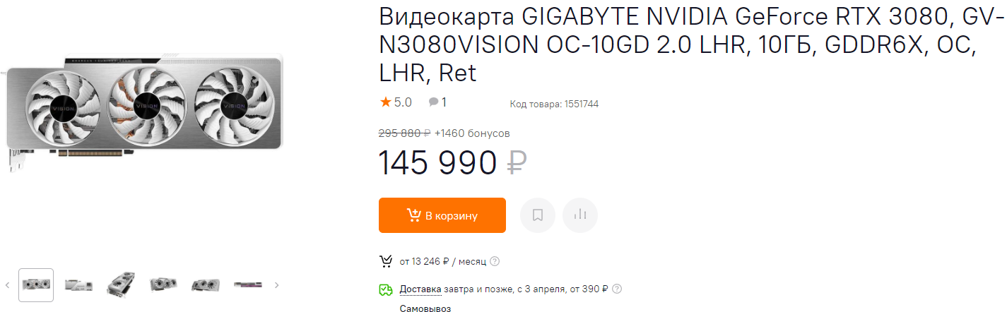 Ну и последняя видеокарта, которую вообще можно назвать флагманской – это GeForce RTX 3080. Она прекрасно справляется с играми в 4К, обладает огромным потенциалом с запасом на много лет вперёд и стоит 146 тысяч рублей. По сравнению с GeForce RTX 3090 – это супервыгодное предложение. Ну а мы согласимся, что для большинства наших читателей это неподъёмная сумма. Именно поэтому ждите, ведь рубль уже почти отыграл падение, ну а в Европе переплата за подобные видеокарты не превышает 25%. Несложно подсчитать, что в итоге GeForce RTX 3080 будет стоить не дороже 100 000 рублей.