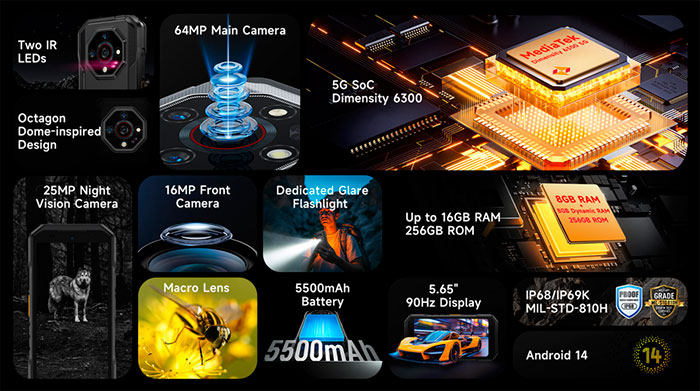 Смартфон соответствует стандартам защиты IP68 и MIL-STD-810H, что гарантирует устойчивость к воде, пыли и механическим повреждениям. При толщине около 15 мм и весе 283 грамма устройство оснащено процессором MediaTek Dimensity 6300 с поддержкой 5G. Пользователям доступно 8 ГБ оперативной памяти и 256 ГБ встроенного хранилища UFS 2.2, которое можно расширить с помощью microSD-карты.
